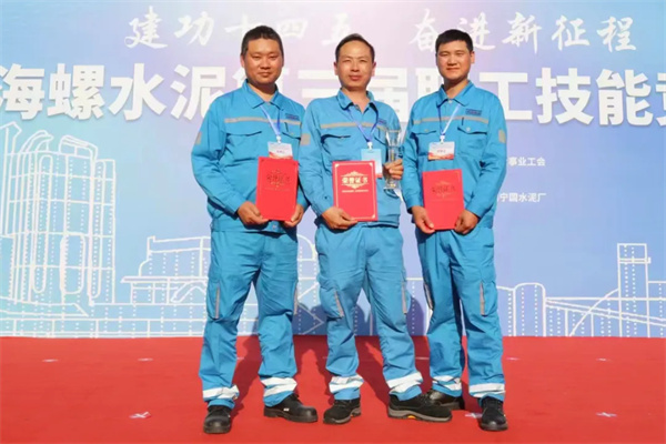 一等獎獲得者(從左至右):廣元海螺李吉國(焊工)、寧國廠劉文文(電工)、荻港海螺陳湯姆(鉗工)、寧國廠張劉(水泥操作工)。