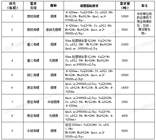 海螺水泥貴州區(qū)域擬對(duì)2022年10月21日至2022年11月20日生產(chǎn)用煤炭進(jìn)行公開招標(biāo),選定中標(biāo)單位,現(xiàn)將相關(guān)招標(biāo)事宜公示如下: