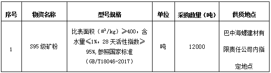 為進(jìn)一步提升S95級(jí)礦粉采購(gòu)招標(biāo)的公平、公正、公開(kāi)透明性,根據(jù)巴中海螺建材(商混)生產(chǎn)礦砂礦粉需求情況,現(xiàn)組織開(kāi)展S95級(jí)礦粉公開(kāi)招標(biāo),特將招標(biāo)事宜公告如下: