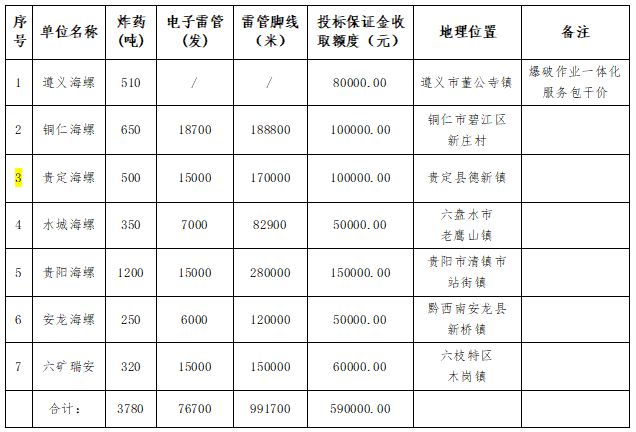 投標(biāo)人在報(bào)價(jià)時(shí)應(yīng)綜合考慮炸藥以及電子雷管的使用量、運(yùn)輸、人工成本以及爆破作業(yè)中一切不確定因素,具體詳見報(bào)價(jià)表,結(jié)合備注信息合理報(bào)價(jià)。投標(biāo)人在報(bào)價(jià)時(shí)應(yīng)綜合考慮炸藥以及電子雷管的使用量、運(yùn)輸、人工成本以及爆破作業(yè)中一切不確定因素,具體詳見報(bào)價(jià)表,結(jié)合備注信息合理報(bào)價(jià)。根據(jù)國(guó)家法律法規(guī)規(guī)定,同一家單位不能同時(shí)做外委爆破、安全監(jiān)理和安全評(píng)估,若一家單位同時(shí)參與三個(gè)標(biāo)段投標(biāo),則優(yōu)先考慮外委爆破標(biāo)段,其次是安全監(jiān)理標(biāo)段,最后是安全評(píng)估標(biāo)段。