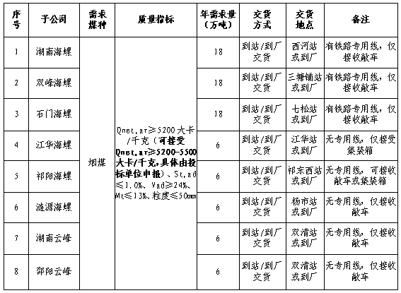 根據(jù)2023年海螺水泥湖南區(qū)域相關(guān)子公司:湖南海螺水泥有限公司(以下,簡(jiǎn)稱“湖南海螺”)、雙峰海螺水泥有限公司(以下,簡(jiǎn)稱“雙峰海螺”)、石門海螺水泥有限責(zé)任公司(以下,簡(jiǎn)稱“石門海螺”)、江華海螺水泥有限責(zé)任公司(以下,簡(jiǎn)稱“江華海螺”)、祁陽(yáng)海螺水泥有限責(zé)任公司(以下,簡(jiǎn)稱“祁陽(yáng)海螺”)、漣源海螺水泥有限責(zé)任公司(以下,簡(jiǎn)稱“漣源海螺”)、湖南省云峰水泥有限公司(以下,簡(jiǎn)稱“湖南云峰”)、邵陽(yáng)市云峰新能源科技有限公司(以下,簡(jiǎn)稱“邵陽(yáng)云峰”)8家子公司的非統(tǒng)購(gòu)直供煤炭采購(gòu)需求,擬組織湖南區(qū)域2023年非統(tǒng)購(gòu)煤炭直供渠道準(zhǔn)入網(wǎng)上公開(kāi)招標(biāo),選定中標(biāo)人。本次招標(biāo)由區(qū)域物資采購(gòu)中心牽頭,湖南海螺組織,為拓寬采購(gòu)渠道,同時(shí)體現(xiàn)公平、公正、公開(kāi)原則,現(xiàn)將招標(biāo)相關(guān)事宜公告如下:
