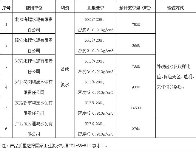 根據(jù)海螺水泥廣西區(qū)域6家水泥企業(yè)生產經營計劃,擬對區(qū)域6家公司2023-2024年度生產用工業(yè)氨水進行公開聯(lián)合招標,本著“公開、公平、公正”的競爭原則,拓寬采購渠道,保證采購質量,現(xiàn)面向社會對本次招標進行公示,歡迎具備條件的單位參加本次招標,現(xiàn)將有關事項公示如下: