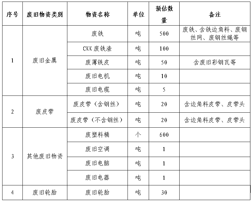 1.包含但不限于以上廢舊物資類別,同時(shí)數(shù)量?jī)H為預(yù)估數(shù)量,具體數(shù)量以實(shí)際過(guò)磅或點(diǎn)數(shù)回收數(shù)量為準(zhǔn)。