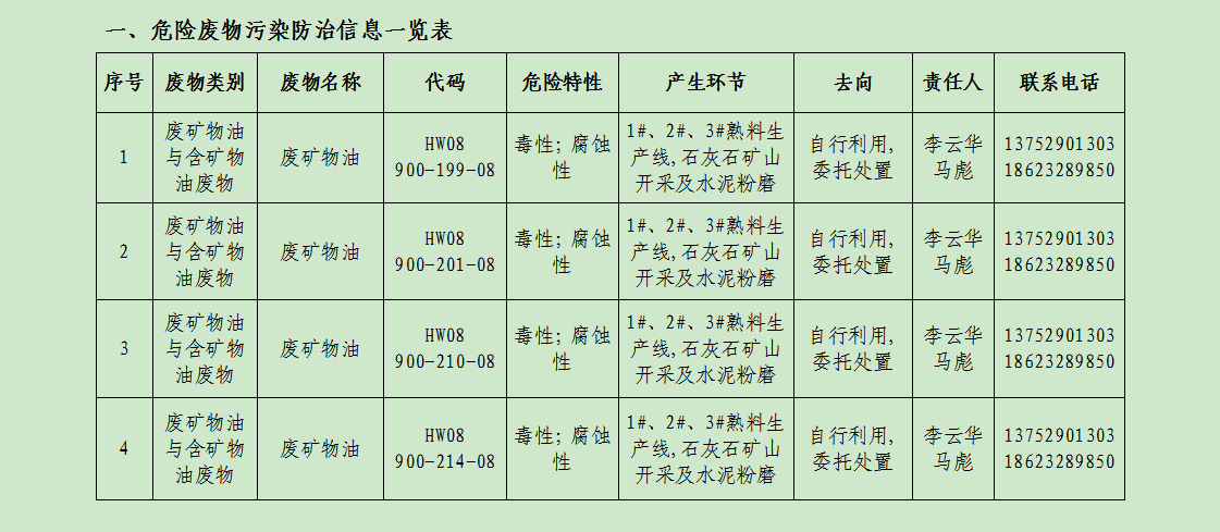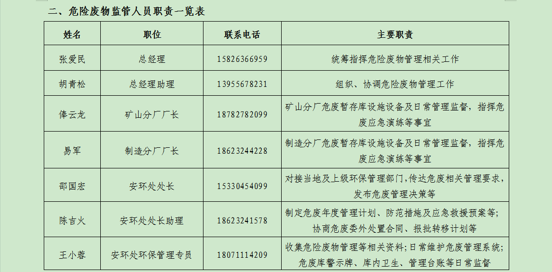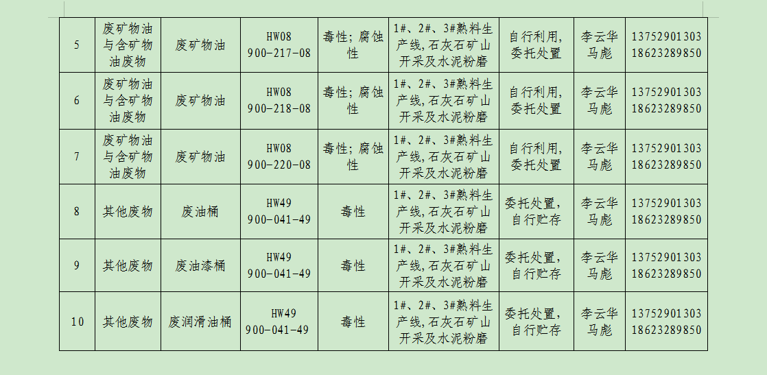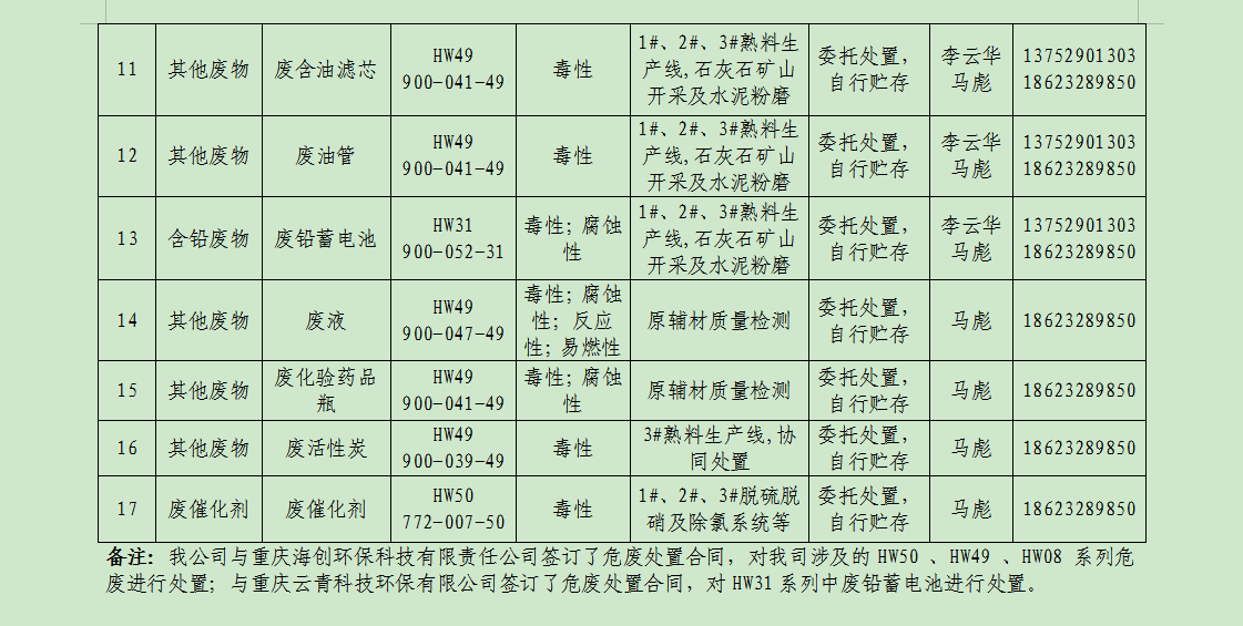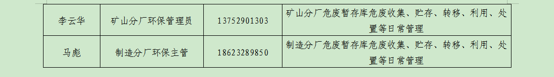 廢棄物的產(chǎn)生單位及管理:礦山分廠由俸云龍負責管理,負責督促員工把產(chǎn)生的危廢分類定期送危廢庫暫存,危廢庫由維修工段工段長負責,負責收集并記錄危廢臺賬;主廠區(qū)由易軍負責管理,負責督促員工把產(chǎn)生的廢分類定期送危廢庫暫存,危廢庫由環(huán)保主管馬彪負責,負責收集并記錄危廢臺賬。危廢庫危廢定期聯(lián)系重慶海創(chuàng)環(huán)??萍加邢挢熑喂?、重慶云青環(huán)保科技有限公司等有資質(zhì)公司回收處理并完善相應(yīng)危廢聯(lián)單。