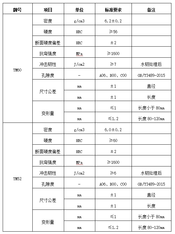 其他要求:硬質(zhì)合金材料不得有因欠燒、過燒導(dǎo)致的外觀、內(nèi)部缺陷;硬質(zhì)合金材料生產(chǎn)用燒結(jié)設(shè)備需要密封良好,不得有因泄漏導(dǎo)致的外表氧化過度;硬質(zhì)合金材料要求無磁性;硬質(zhì)合金材料燒結(jié)時需盡可能減少鎂砂等耐火材料的粘連,避免因粘連導(dǎo)致的尺寸超差;硬質(zhì)合金材料在澆注鋼水溫度小于1500℃時,不得出現(xiàn)變形、斷裂、漂浮問題。若出現(xiàn)以上問題,損失由供應(yīng)廠家承擔(dān)。