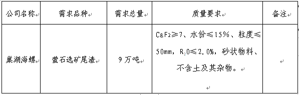 為做好巢湖海螺水泥有限責(zé)任公司螢石選礦尾渣供應(yīng)工作,確保產(chǎn)品的可靠性、穩(wěn)定性,規(guī)范采購(gòu)行為,本著“公開、公平、公正”的競(jìng)爭(zhēng)原則,選擇經(jīng)營(yíng)能力較好、產(chǎn)品質(zhì)量較優(yōu)、保供和服務(wù)能力較強(qiáng)的供貨單位,特將本次招標(biāo)的有關(guān)事宜公告如下,歡迎有實(shí)力的投標(biāo)單位參加本次招投標(biāo)活動(dòng):