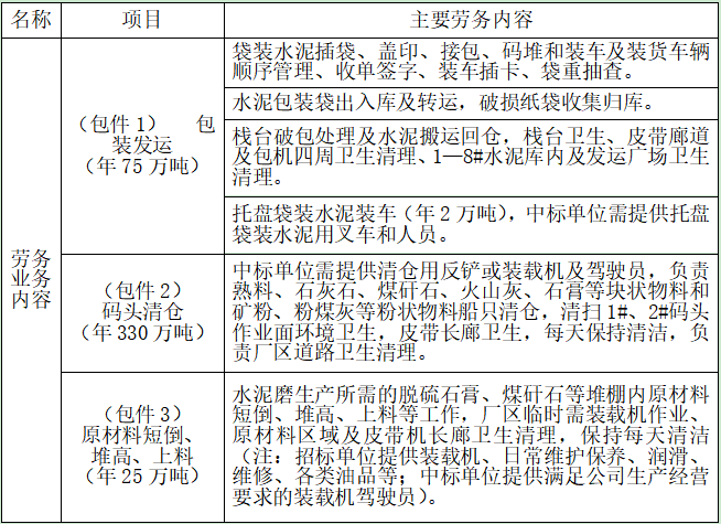 以上包件勞務(wù)合同期限為1年(自勞務(wù)合同簽訂之日起計(jì)算),招標(biāo)人年水泥包裝量約75萬(wàn)噸,年碼頭清倉(cāng)量約330萬(wàn)噸、年原材料短倒上料量約25萬(wàn)噸,具體以實(shí)際發(fā)生數(shù)量為準(zhǔn)。