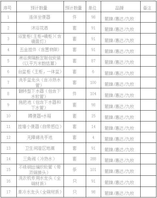 1.標的內(nèi)容:衛(wèi)浴材料,具體名稱、規(guī)格及數(shù)量等以招標文件清單約定為準,產(chǎn)品質(zhì)量需達到投標品牌對應(yīng)質(zhì)保要求,施工結(jié)束有剩余,若包裝完好不影響二次銷售的需接受退貨。