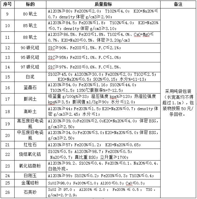 4、上述88礬土、97碳化硅、紅柱石、燒結(jié)氧化鋁、白剛玉、金屬硅粉和石英砂等招標(biāo)采購(gòu)原材料,因采購(gòu)量不確定,本次招標(biāo)僅作為本公司采購(gòu)備用原材料??紤]上述原材料存在無(wú)執(zhí)行情況,投標(biāo)保證金、標(biāo)書(shū)工本費(fèi)和合同履約保證金暫不收取。