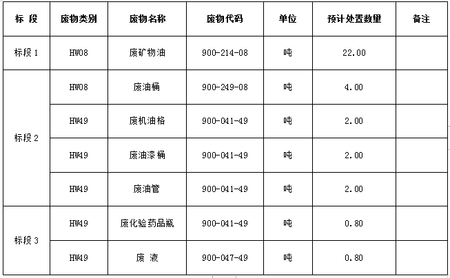 1.處置標(biāo)的內(nèi)容:廢礦物油、廢油桶、廢機(jī)油格、廢油漆桶、廢油管、廢化驗(yàn)藥品瓶、廢液。