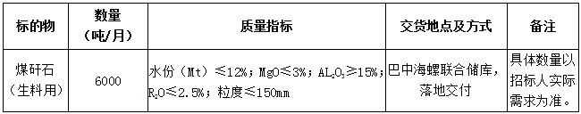 根據(jù)巴中海螺生產(chǎn)經(jīng)營(yíng)需求,現(xiàn)對(duì)生料用煤矸石采購(gòu)業(yè)務(wù)進(jìn)行公開招標(biāo),為體現(xiàn)公平、公正、公開、透明的原則,現(xiàn)將招標(biāo)相關(guān)事宜公告如下: