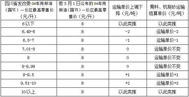 2.本次招標(biāo)運(yùn)輸費(fèi)用為運(yùn)輸?shù)綇S卸貨所發(fā)生的一切費(fèi)用。運(yùn)價(jià)在合同期內(nèi)執(zhí)行油價(jià)與運(yùn)價(jià)聯(lián)動(dòng)機(jī)制的運(yùn)輸招標(biāo):以四川省發(fā)改委2024年3月1日公布的0#車用柴油(國(guó)Ⅵ)一價(jià)區(qū)最高零售價(jià)***元/升作為油價(jià)聯(lián)動(dòng)基準(zhǔn)價(jià),如在合同期內(nèi)四川省發(fā)改委公布0#車用柴油(國(guó)Ⅵ)一價(jià)區(qū)最高零售價(jià)格(以下簡(jiǎn)稱:公布最新油價(jià))漲跌幅度超過1元/升,啟動(dòng)油價(jià)聯(lián)動(dòng),調(diào)整日期與四川省發(fā)改委公布油價(jià)調(diào)整日期同步。具體方式為:①若合同期內(nèi)公布最新油價(jià)較基準(zhǔn)價(jià)上調(diào)或下降幅度小于等于1元/L,則運(yùn)輸費(fèi)用不作調(diào)整;②若合同期內(nèi)公布最新油價(jià)較基準(zhǔn)價(jià)漲跌幅度大于1元/L,小于等于1.5元/L,則運(yùn)輸費(fèi)用在合同價(jià)基礎(chǔ)上上調(diào)或下降1元/噸;③若合同期內(nèi)公布最新油價(jià)較基準(zhǔn)價(jià)漲跌幅度大于1.5元/L,小于等于2元/L,則運(yùn)輸費(fèi)用在合同價(jià)基礎(chǔ)上上調(diào)或下降2元/噸,以次類推。