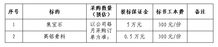 根據(jù)本公司自2024年2季度耐火磚生產(chǎn)計(jì)劃。為確保焦寶石和高鋁骨料及時(shí)采購(gòu)到貨。現(xiàn)本著“公開(kāi)、公平、公正、透明”的原則進(jìn)行公開(kāi)招標(biāo),誠(chéng)邀經(jīng)營(yíng)資質(zhì)能力較好、保供和服務(wù)能力較強(qiáng)的生產(chǎn)型或貿(mào)易型企業(yè)參加投標(biāo)。現(xiàn)就招標(biāo)相關(guān)事項(xiàng)請(qǐng)示如下: