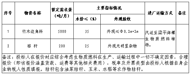 2.本次招標(biāo)共設(shè)置竹木邊角料、秸稈2個(gè)標(biāo)段,開(kāi)標(biāo)時(shí)分標(biāo)段評(píng)標(biāo),采取分不同供貨時(shí)間綜合到廠不含稅總額最低為中標(biāo)原則,按投標(biāo)總額從低到高的順序選擇預(yù)中標(biāo)單位,直至排滿標(biāo)的需求量為止。